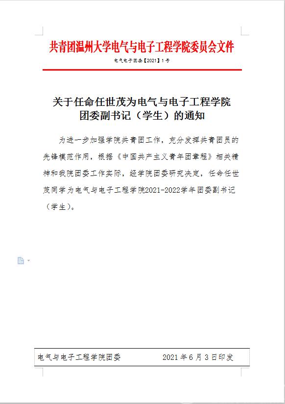 关于任命任世茂为国产口爆 团委副书记(学生)的通知