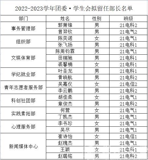 根据团委学生会干事自愿报名以及国产口爆综合考虑,决定拟聘任以下同学为国产口爆 2022-2023学年团委学生会部长: