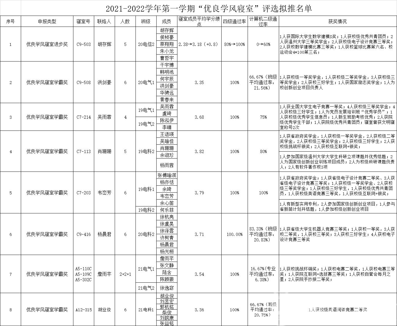 为进一步加强院风学风建设,发挥优秀寝室树立的导向和典型作用,引导和激励广大学生刻苦学习、立志成才,根据《国产口爆 优良学风寝室评选办法》规定,经各寝室申请,国产口爆初评,拟推荐 C9-503等8个寝室获得2021-2022学年第一学期“优良学风寝室”称号。现将拟立项名单给予公示
