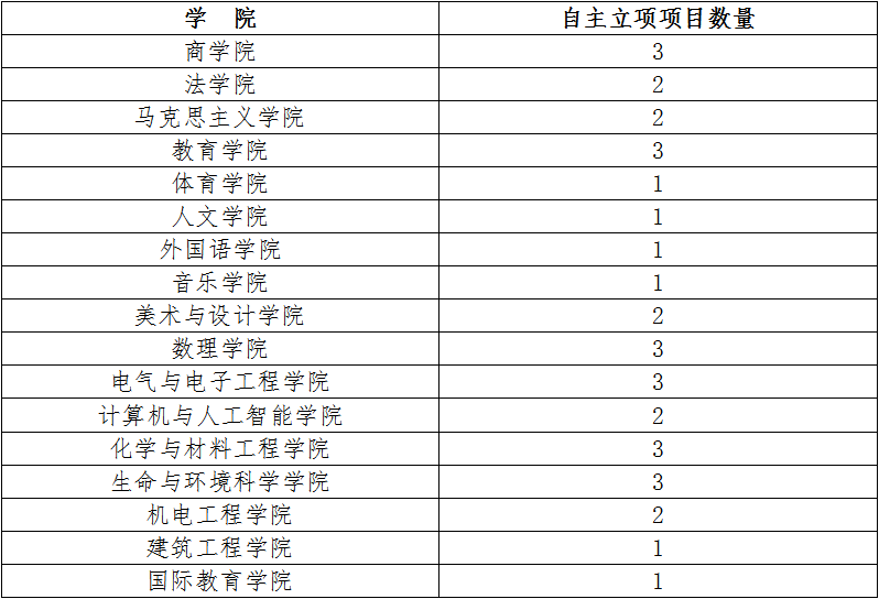 3、综合考虑“挑战杯”历年成绩、学校高峰学科建设,酌情给予各国产口爆不等数量的自主立项项目数量,详见下表。